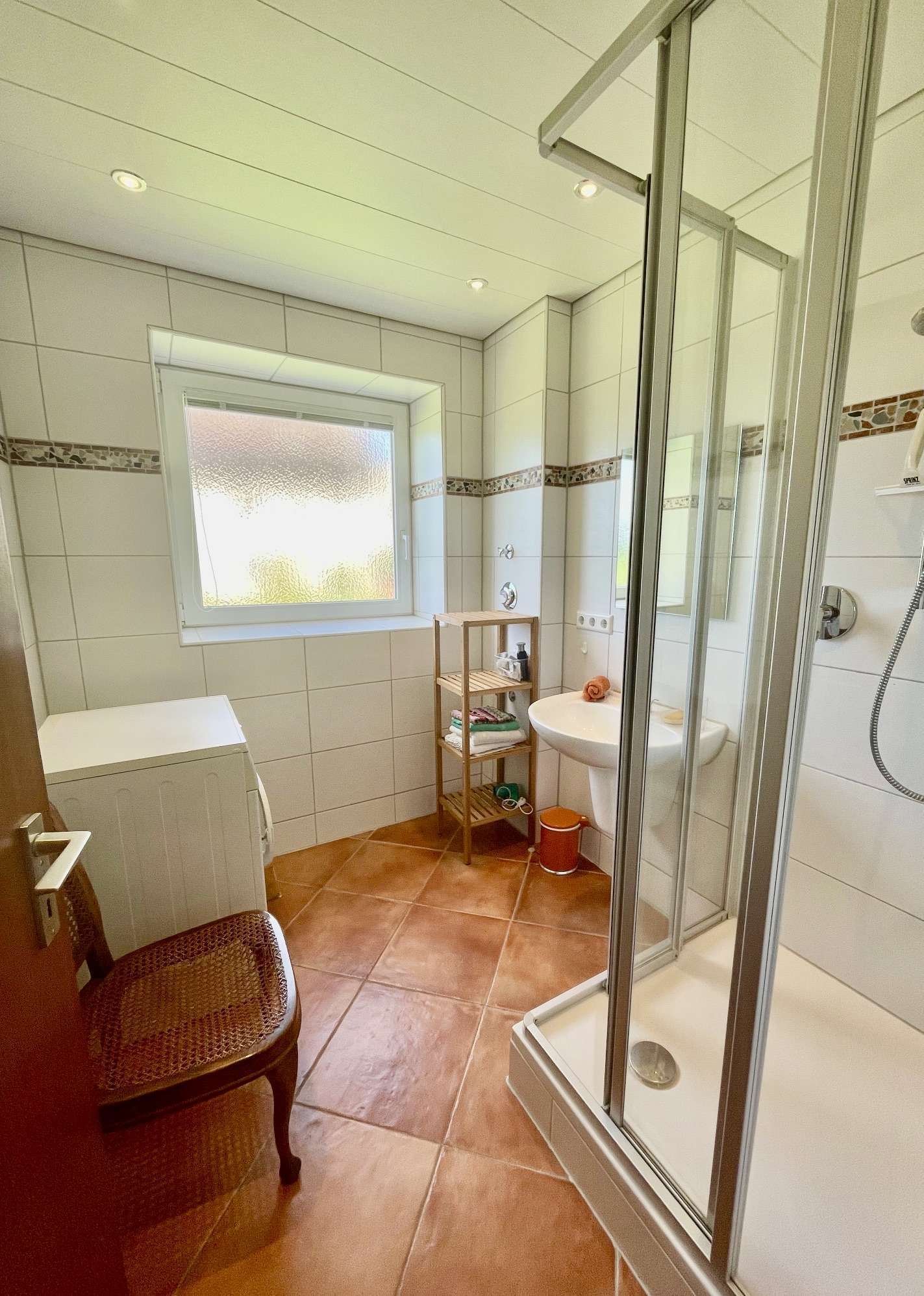 Das Badezimmer ist mit Dusche und ausgestattet.